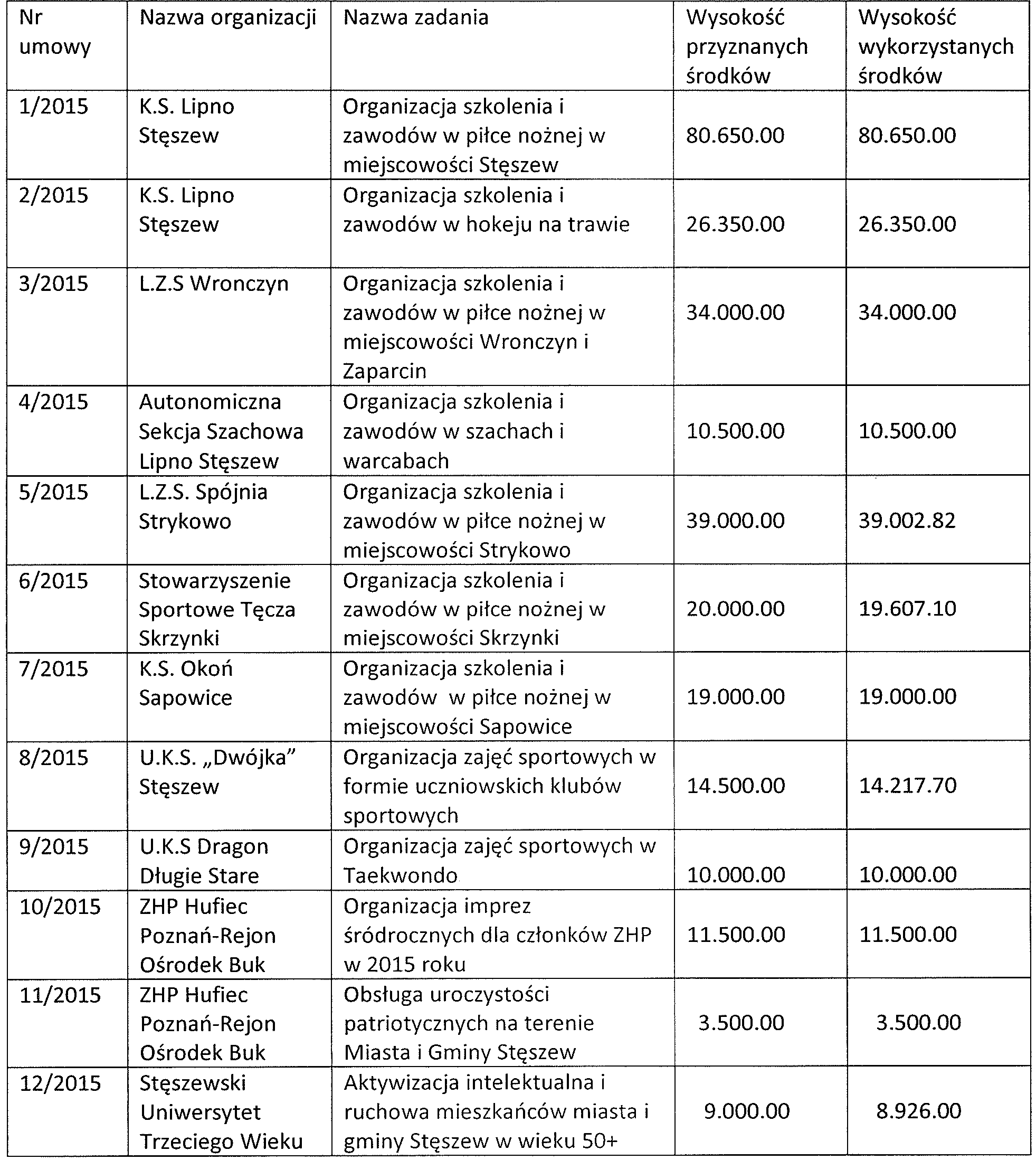 Sprawozdanie z realizacji Programu Współpracy Gminy Stęszew z organizacjami pozarządowymi oraz innymi podmiotami prowadzącymi działalność pożytku publicznego za 2015 rok. Zgodnie z art.5a ust.3 ustawy z dnia 24 kwietnia 2003 r. o działalności pożytku publicznego i o wolontariacie (Dz. U. z 2016 r. 239 ) Burmistrz Gminy Stęszew zobowiązany jest przedłożyć Radzie Gminy sprawozdanie z realizacji programu współpracy z organizacjami pozarządowymi oraz podmiotami prowadzącymi działalność pożytku publicznego za rok poprzedni. Projekt programu współpracy Gminy Stęszew na rok 2015 z organizacjami pozarządowymi oraz innymi podmiotami prowadzącymi działalność pożytku publicznego został poddany konsultacjom na podstawie Zarządzenia Nr 392/2014 Burmistrza Stęszewa z dnia 25 sierpnia 2014r. Burmistrz zaprosił do konsultacji przedstawicieli organizacji pozarządowych działających na rzecz mieszkańców gminy Stęszew i podmioty wymienione w art.3 ust.3 ustawy o działalności pożytku publicznego i o wolontariacie polegających na przedłożeniu pisemnych propozycji zadań i uwag do projektu uchwały w sprawie : Programu Współpracy Gminy Stęszew z organizacjami pozarządowymi oraz innymi podmiotami prowadzącymi działalność pożytku publicznego na 2015 rok .Ogłoszenie o przeprowadzanych konsultacjach zamieszczono w Biuletynie Informacji Publicznej, na tablicy ogłoszeń oraz zostało wysłane do organizacji działających na terenie Miasta i Gminy Stęszew. Zainteresowane podmioty otrzymały możliwość przekazania swoich propozycji i uwag drogą korespondencyjną, elektroniczną lub osobiście w Urzędzie Miejskim Gminy Stęszew w terminie do dnia 8.09.2014 r. Celem Programu współpracy z organizacjami pozarządowymi jest zaspokojenie potrzeb społecznych mieszkańców Gminy oraz wzmacnianie rozwoju społeczeństwa obywatelskiego , poprzez budowanie i umacnianie partnerstwa pomiędzy Gminą Stęszew a organizacjami pozarządowymi. Priorytetowe zadania, które mogą być zlecane do realizacji organizacjom prowadzącym działalność statutową w danej dziedzinie : 1. organizowanie i prowadzenie działalności sportowej, 2. organizowanie i prowadzenie działalności sportowej przez uczniowskie kluby sportowe, 3. działalność kulturalna i oświatowa prowadzona przez organizacje harcerskie, 4. opieka paliatywna, 5. działalność na rzecz osób w wieku emerytalnym, 6. nauki, szkolnictwa wyższego, edukacji, oświaty i wychowania na rzecz mieszkańców w wieku 50+. Do Urzędu nie wpłynęła żadna propozycja ani uwaga do projektu uchwały. Rada Miejska Gminy Stęszew podjęła Uchwałę Nr II /20 /2014 w sprawie Programu Współpracy Gminy Stęszew z organizacjami pozarządowymi oraz innymi podmiotami prowadzącymi działalność pożytku publicznego na 2015 rok , zaplanowano środki w wysokości 275.000.00 zł. Program realizowany był od dnia 1 stycznia 2015r. do dnia 31 grudnia 2015r. Środki zaplanowane na wspieranie realizacji zadań publicznych przez organizacje pozarządowe na 2015 rok przyznawane były w trybie otwartych konkursów ofert. Burmistrz Gminy Stęszew ogłosił konkurs Zarządzeniem Nr 3/2014 w dniu 29 grudnia 2014 r. Konkurs dotyczył zadań z zakresu: 1. Upowszechniania kultury fizycznej i sport. 2. Upowszechniania kultury i oświaty wśród dzieci i młodzieży przez organizacje harcerskie. 3. Działalności na rzecz osób w wieku emerytalnym, nauki, szkolnictwa wyższego, edukacji ,oświaty i wychowania na rzecz mieszkańców w wieki 50+. 4. Ochrony i promocji zdrowia. Ogłoszenie zamieszczone było z co najmniej 21-dniowym wyprzedzeniem : w Biuletynie Informacji Publicznej, na tablicy ogłoszeń Urzędu Miejskiego Gminy Stęszew, na stronie internetowej Urzędu. Na powyższy konkurs wpłynęło 12 ofert .Na zadanie z zakresu ochrony i promocji zdrowia nie wpłynęła oferta. Zostały podpisane 3 umowy , 9 ofert zostało odrzuconych. W dniu 2 lutego 2015 r. Zarządzeniem Nr 31/2015 Burmistrz ogłosił otwarty konkurs ofert na realizację zadań publicznych z zakresu : 1.Upowszechniania kultury fizycznej i sportu. 2.Upowszechniania kultury i oświaty wśród dzieci i młodzieży przez organizacje harcerskie. 3.Działalności na rzecz osób w wieku emerytalnym, nauki, szkolnictwa wyższego, edukacji, oświaty i wychowania na rzecz mieszkańców w wieku 50+. Wpłynęło 9 ofert, podpisano 9 umów. Zestawienie zadań w roku 2015 w trybie konkursowym :